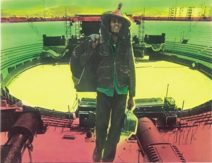 Polaroid-Fotografien Die Aufnahme von Bob Marley entstand 1978 auf Ibiza, kurz nachdem Pico Risto den Musiker am Flughafen abgeholt hatte. Erstmals wurde zu dieser Zeit die Arena nicht für den Stierkampf, sondern für ein Konzert genutzt. Risto schwärmt noch heute von der Warmherzigkeit und Spontaneität der Reggae-Ikone. Marley war kurz nach seiner Ankunft auf dem Plaza de Toros kurzerhand mit dem Künstler in einen Linienbus gestiegen, um Freunde zu besuchen und ignorierte die laut schimpfenden Manager, die den Bus umkreisten und bereits an eine Entführung glaubten. Eine lustige Geschichte ist auch mit dem Selbstporträt des Künstlers verbunden. Dieser war mit seinem Motorrad auf Ibiza unterwegs, als ein heftiges Unwetter ausbrach. Um sich wenigstens etwas gegen die Regengüsse zu schützen, bastelte er sich kurz entschlossen einen Regenmantel aus Plastiktüten. Eine weitere Fotografie zeigt ein damals aktuelles Politikum. Ein riesiges neu errichtetes Hochhaushotel musste kurz nach seiner Fertigstellung gesprengt werden, da man feststellte, das es sich in der Flugschneise befand; angeblich war ein Flugzeug fast an ein Betonteil des Hochhauses gestoßen. Ristos Aufnahme, nach der später ein Siebdruckplakat für den Club Amnesia erstellt wurde, zeigt Menschen auf den Ruinen dieses Hotels. |